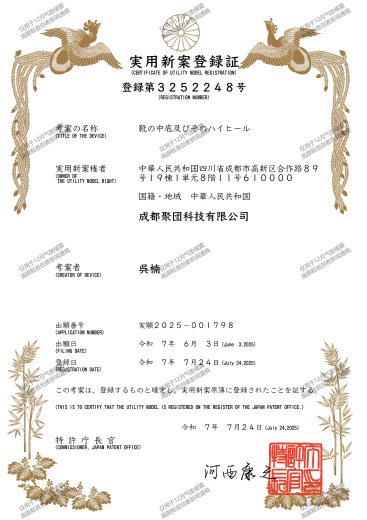 此项围绕「鞋中底结构」的原创性优化,已获得中国国家知识产权局授予的外观设计专利如缓震鞋垫(专利号:ZL 2024 3 0683514.6)、鞋垫(可拆卸缓震)(专利号: ZL 2025 3 0218689.4)、鞋垫气囊(专利号: ZL 2025 3 0275843.1),和实用新型专利如一种鞋中底及其高跟鞋(专利号:ZL 2024 2 2576484.6),并已通过日本、德国等相关国际专利体系的认证。品牌研发负责人透露,该技术是品牌多年专注舒适科技研发的成果缩影,截至目前,WUDASHU在鞋履舒适科技相关领域已累计获得数项国家专利,形成了壁垒性的技术护城河。