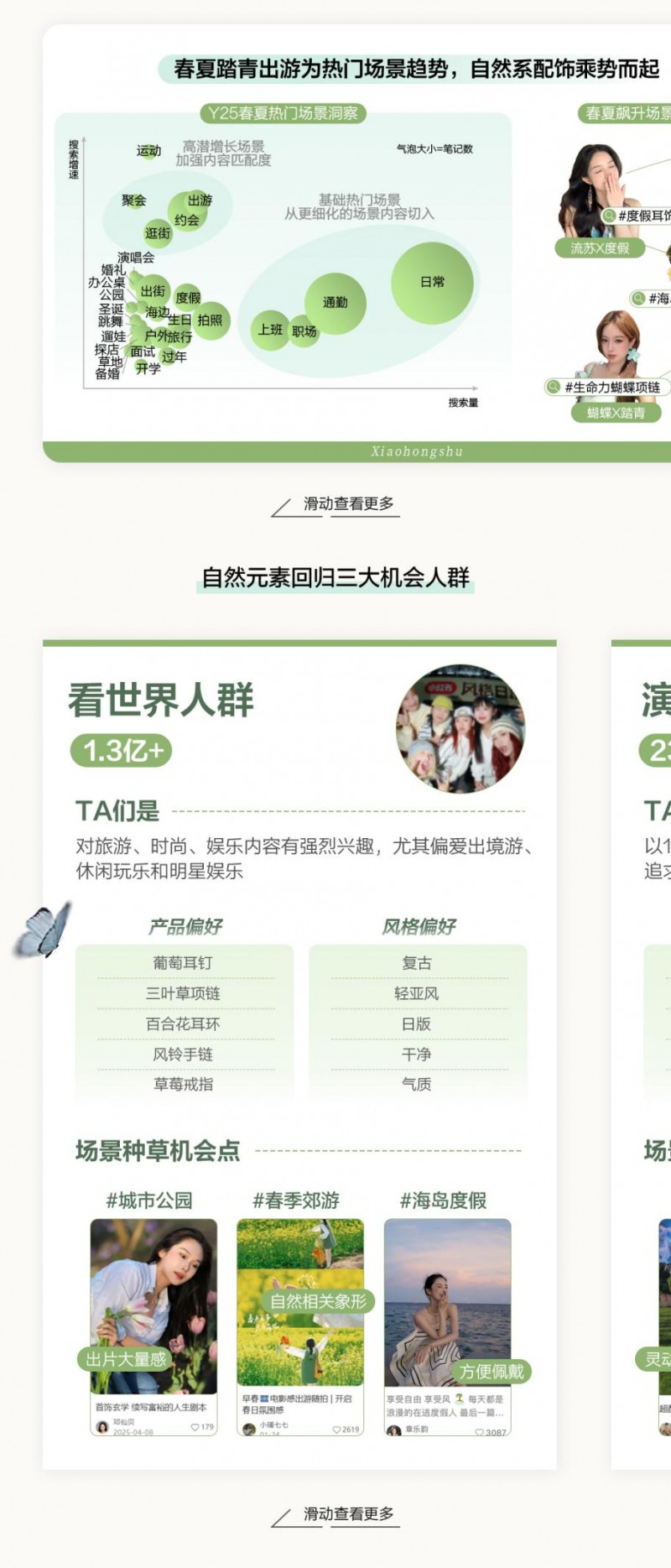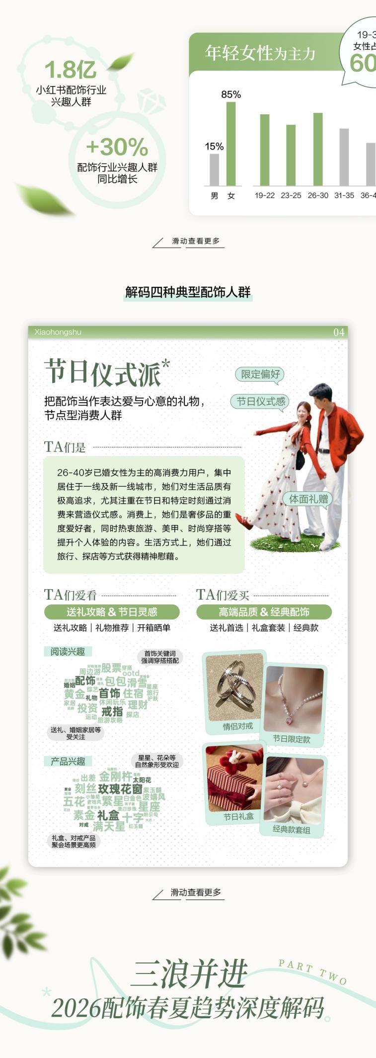作为配饰消费决策的重要阵地与穿搭灵感策源地,小红书已成为年轻群体获取配饰趋势、沉淀搭配灵感、完成消费决策的首选平台。平台配饰兴趣人群持续扩容,同比增长30%,配饰消费也正从小众精致需求,逐步渗透进更广泛、更高频的日常生活,行业增长势能持续释放。对于品牌而言,春夏不仅是新品集中上新、用户需求活跃的关键节点,也是抢占风格心智、放大种草势能、实现生意增长的重要窗口。